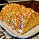 Fruity Pebbles Cheesecake Tacos are a delightful dessert that combines the flavors of cheesecake with the fun and colorful crunch of Fruity Pebbles cereal, all wrapped in a taco shell.