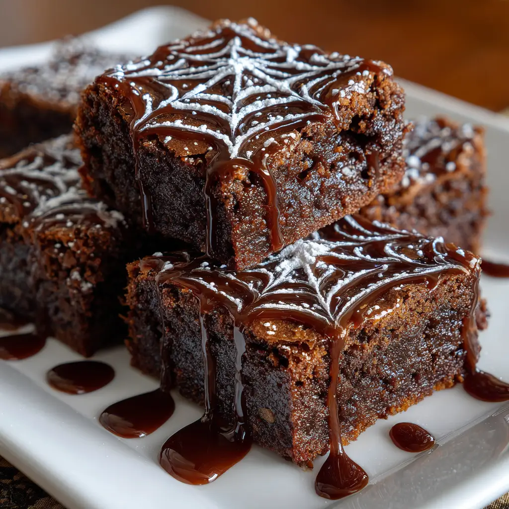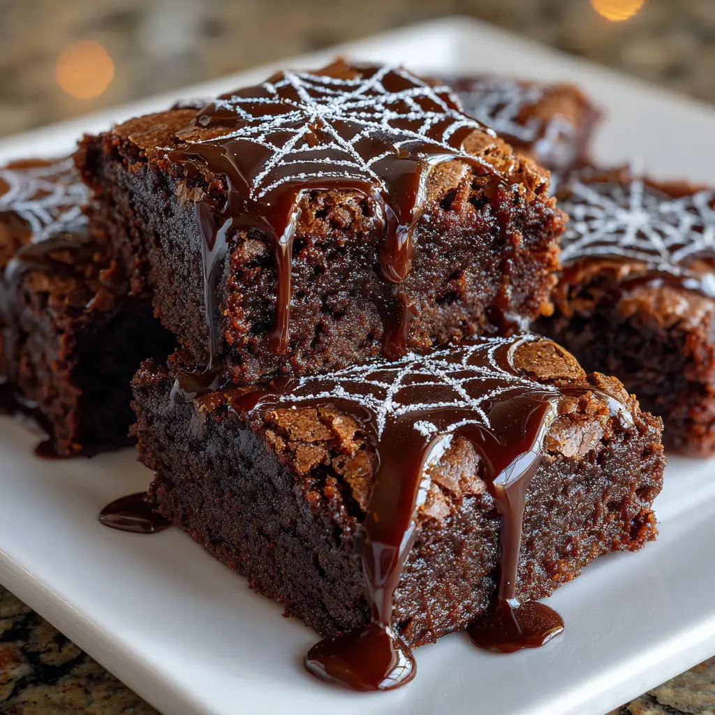 Deliciously rich brownies decorated with a spooky spiderweb design, perfect for Halloween or any festive occasion.