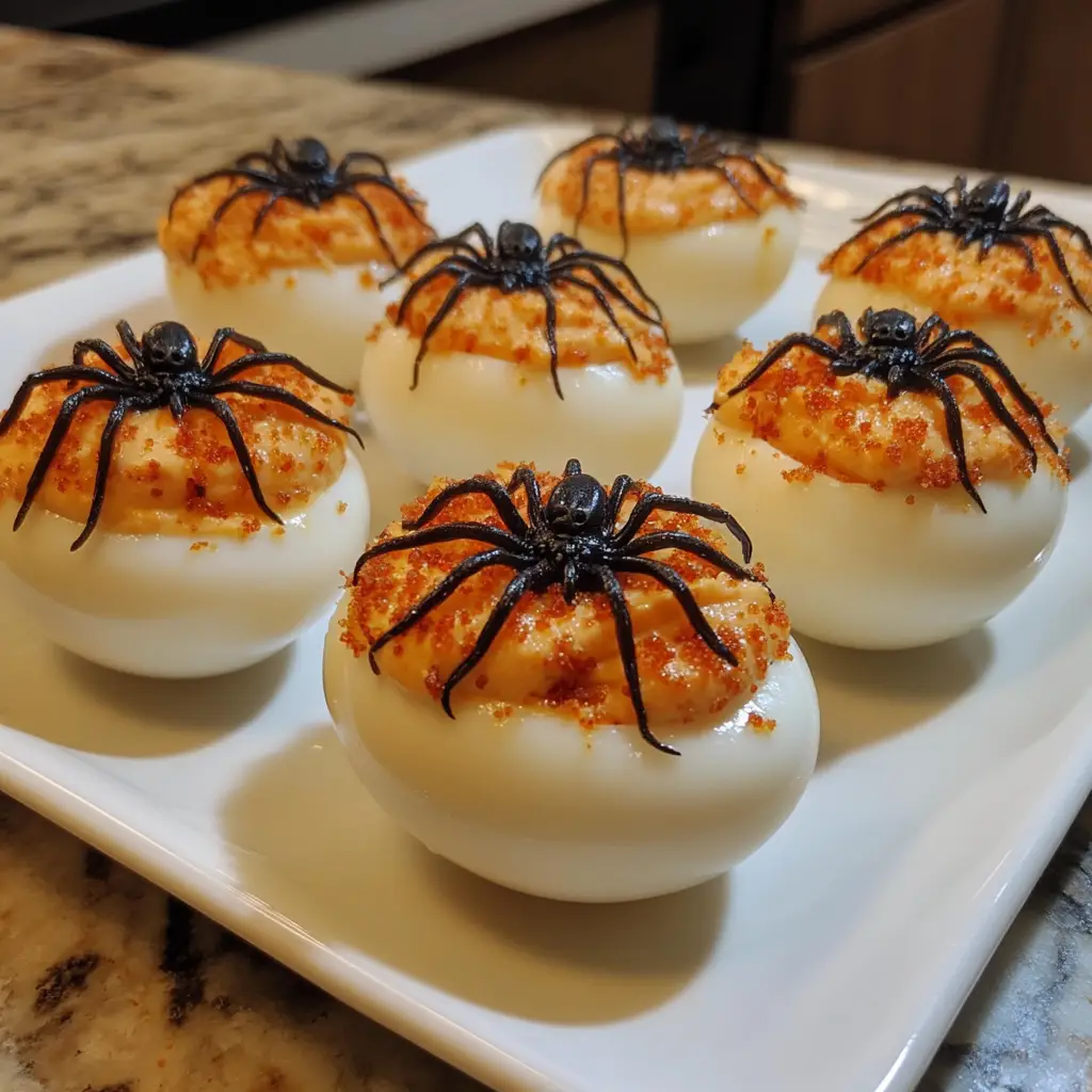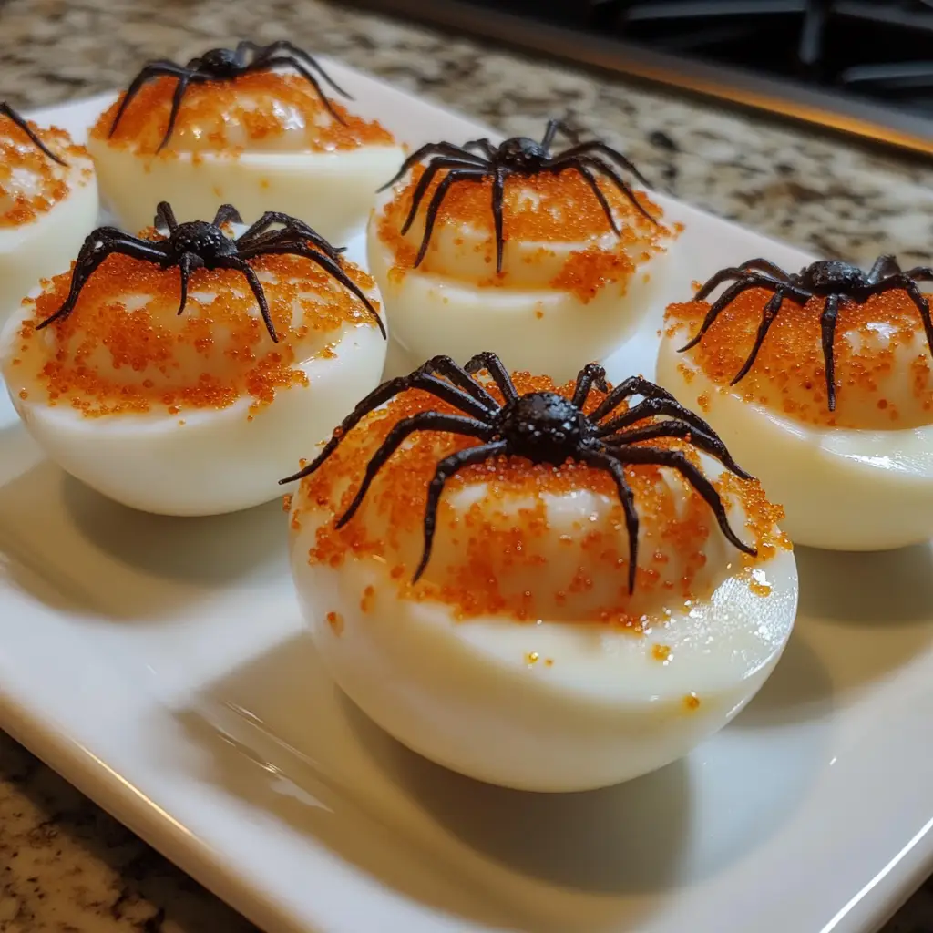 A fun and spooky twist on traditional deviled eggs, perfect for Halloween parties.